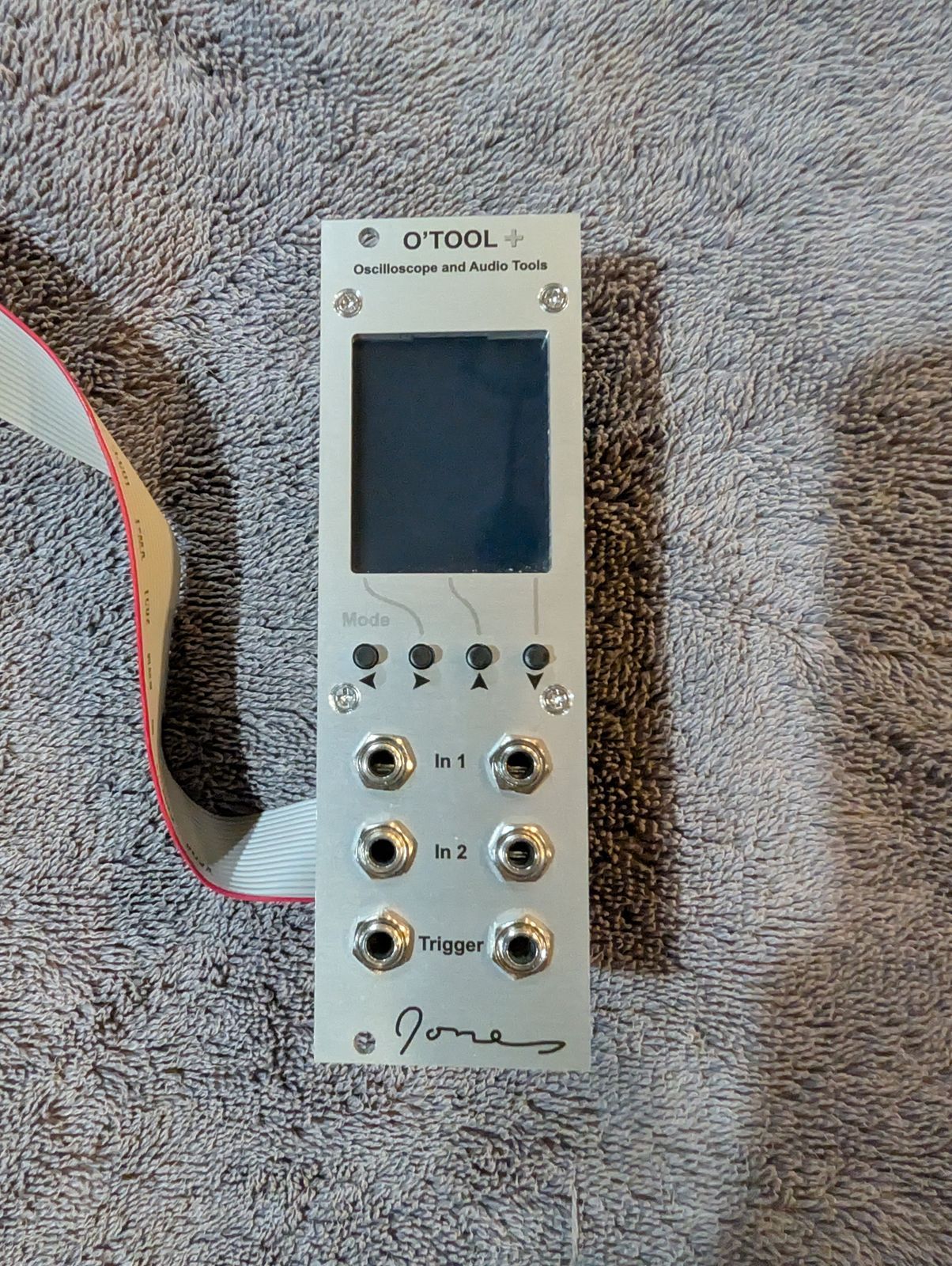 Dave Jones Design O’Tool Plus in excellent condition — clean panel, no marks, fully functional. This 8HP Eurorack oscilloscope and multi-tool provides visual feedback for your modular system across 15+ modes: single/dual/3D oscilloscope, X/Y display, spectrum analyzer (linear and log), spectrogram, VU/peak/level meters, voltmeter, frequency counter, tuner, and BPM meter. Temperature-stable, extremely accurate, with two signal inputs that pass through to other modules. Firmware upgradable, three user-preset slots. An indispensable utility module. Includes power cable.