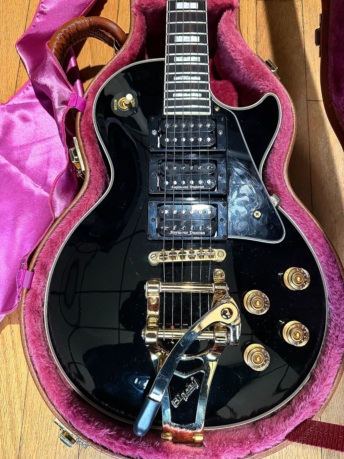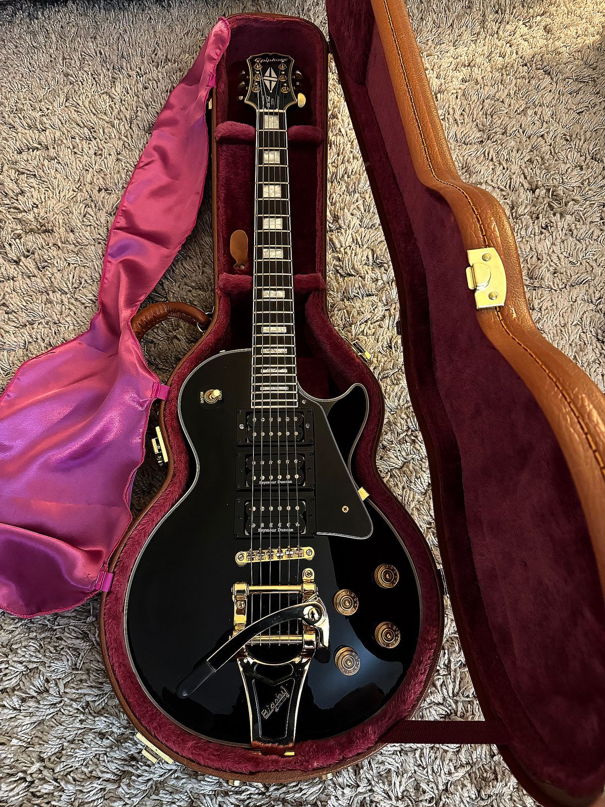 Here we have a very nice Epiphone Les Paul Custom with nice upgrades. Guitar has a 3 pickup configuration. I am not sure if this is factory done, or aftermarket. I am not the original owner so I don’t have that information. If it is aftermarket, it was done very well and professionally. Seymour Duncan pickups, I am also not sure of the model. Bigsby bridge was added, I do not have the original. Guitar is in good condition with some normal cosmetic wear and tear. Epiphone hardshell case.