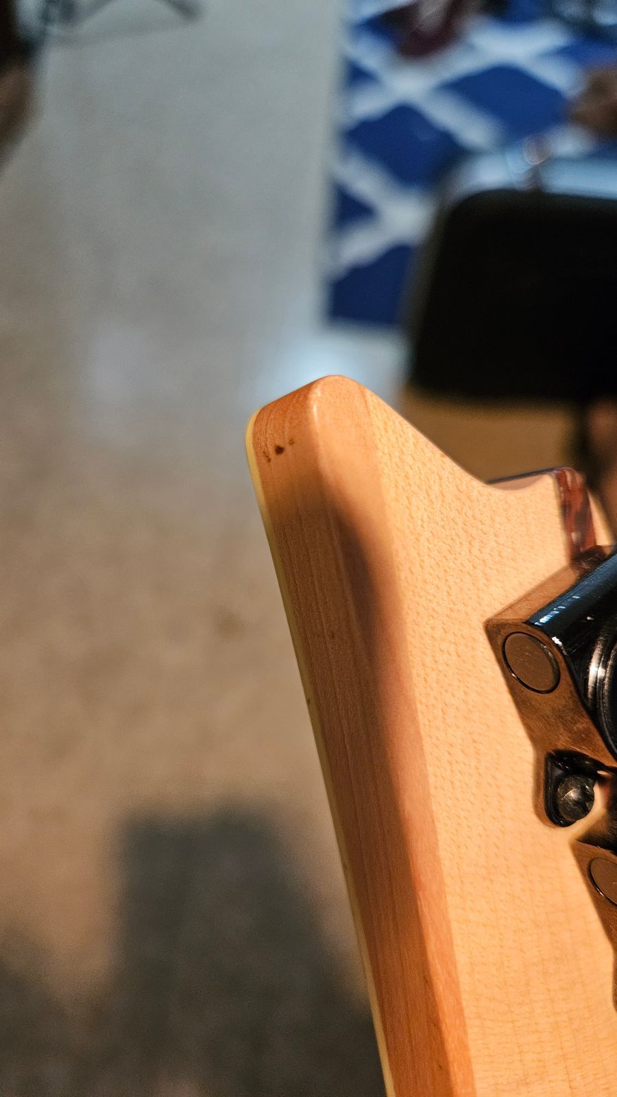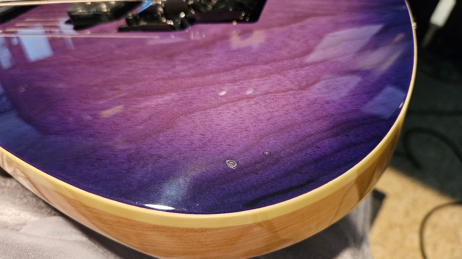 There is one visible ding on the face of the body where your arm rests, and another on the backside by the output jack. The headstock tip has some marks. The guitar also has other small scratches and wear from use that I can’t pick up on camera.