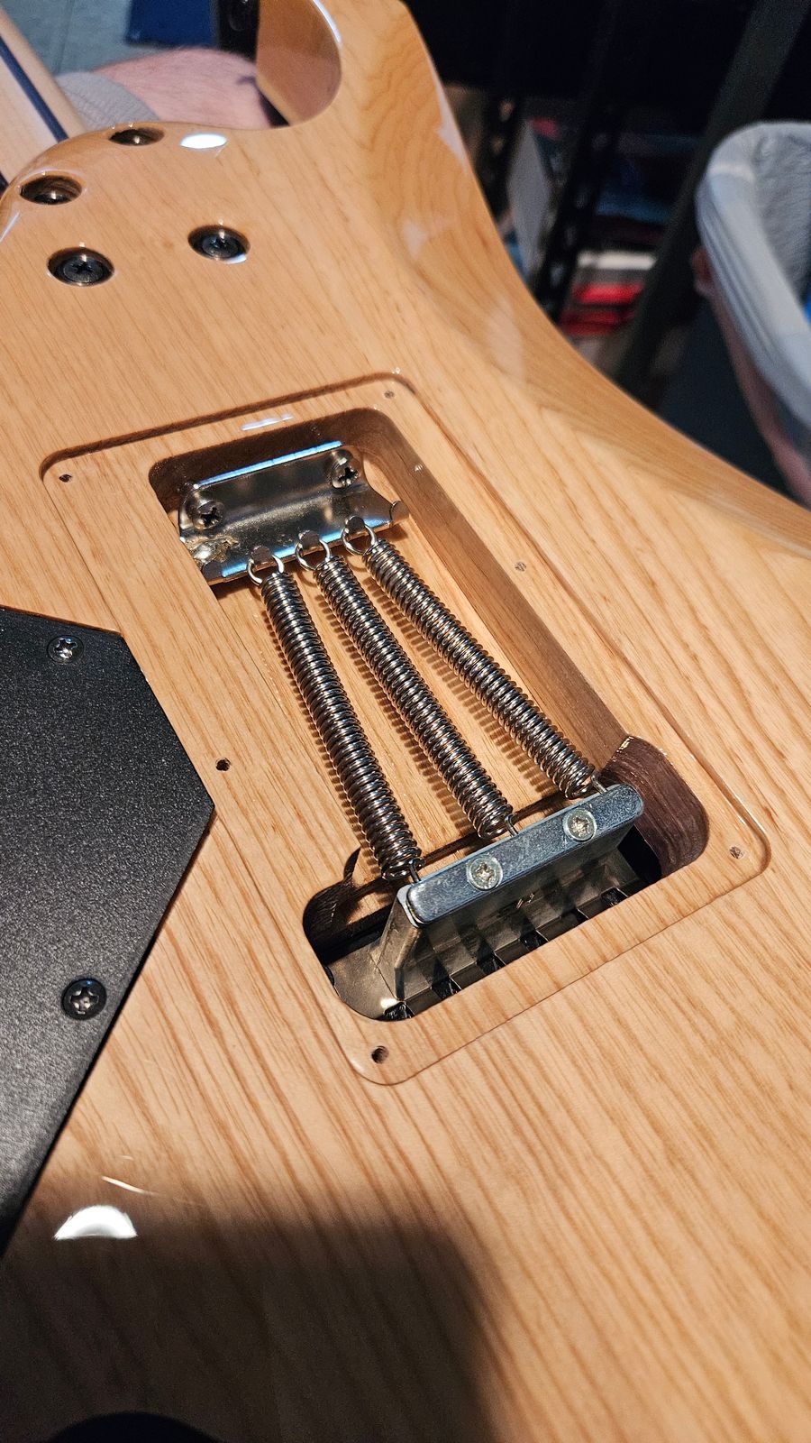Guitar works as it should and is set up with low action. It does not have the backplate cover.