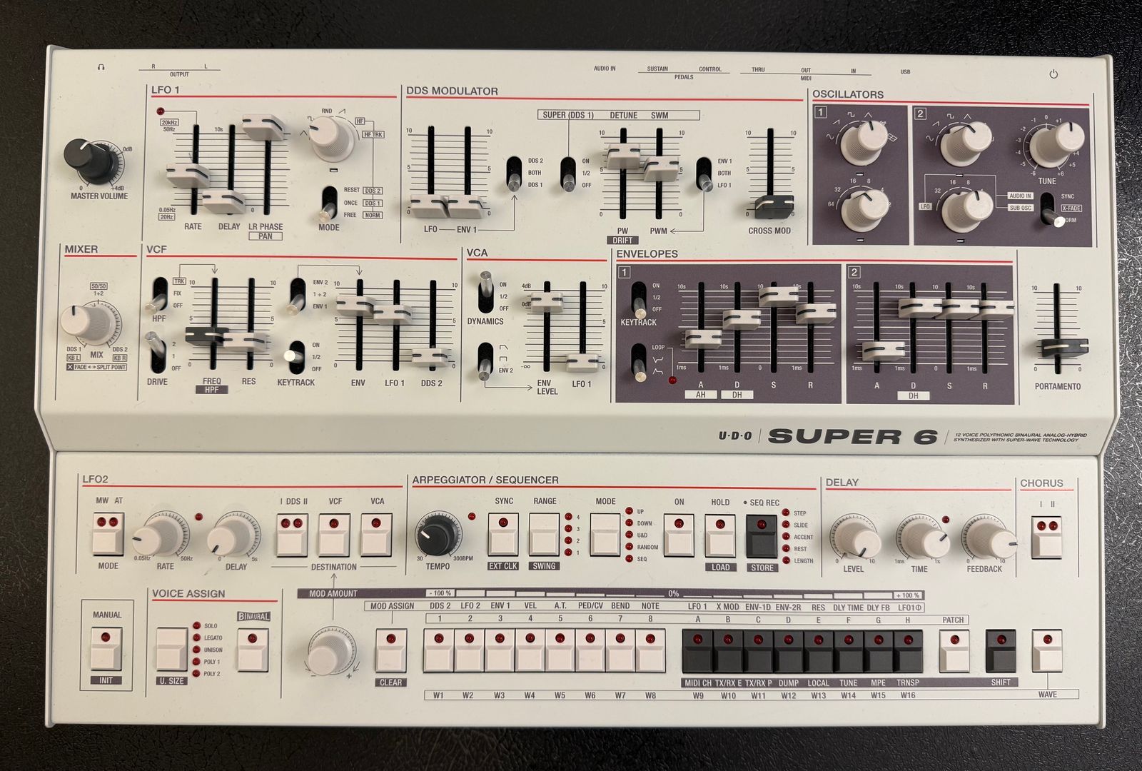 • Model: Super 6 Desktop 12-Voice Polyphonic Binaural Analog-Hybrid Synthesizer